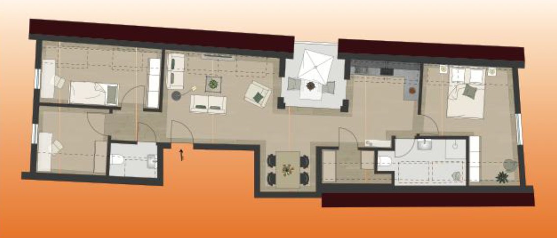 Die Wohnung verfügt über ein Badezimmer mit Fenster, ausgestattet mit Dusche und Doppelwaschbecken, wodurch Tageslicht und eine angenehme Belüftung gewährleistet sind. Zusätzlich steht ein separates Gäste-WC zur Verfügung.