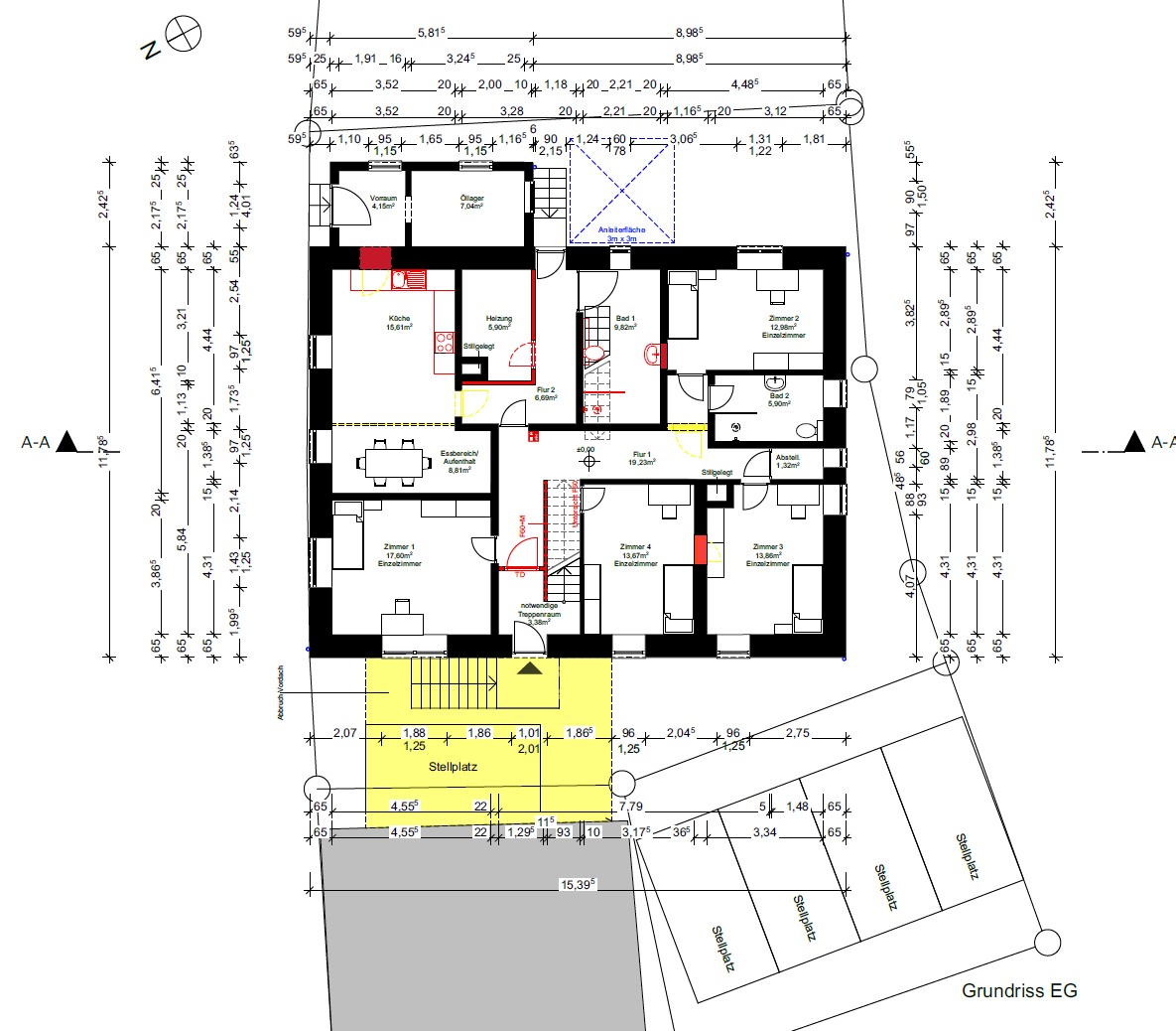 Parkmöglichkeiten sind auf dem Grundstück großzügig vorhanden. Bei sorgfältiger Nutzung können dort bis zu 7–8 Fahrzeuge abgestellt werden.