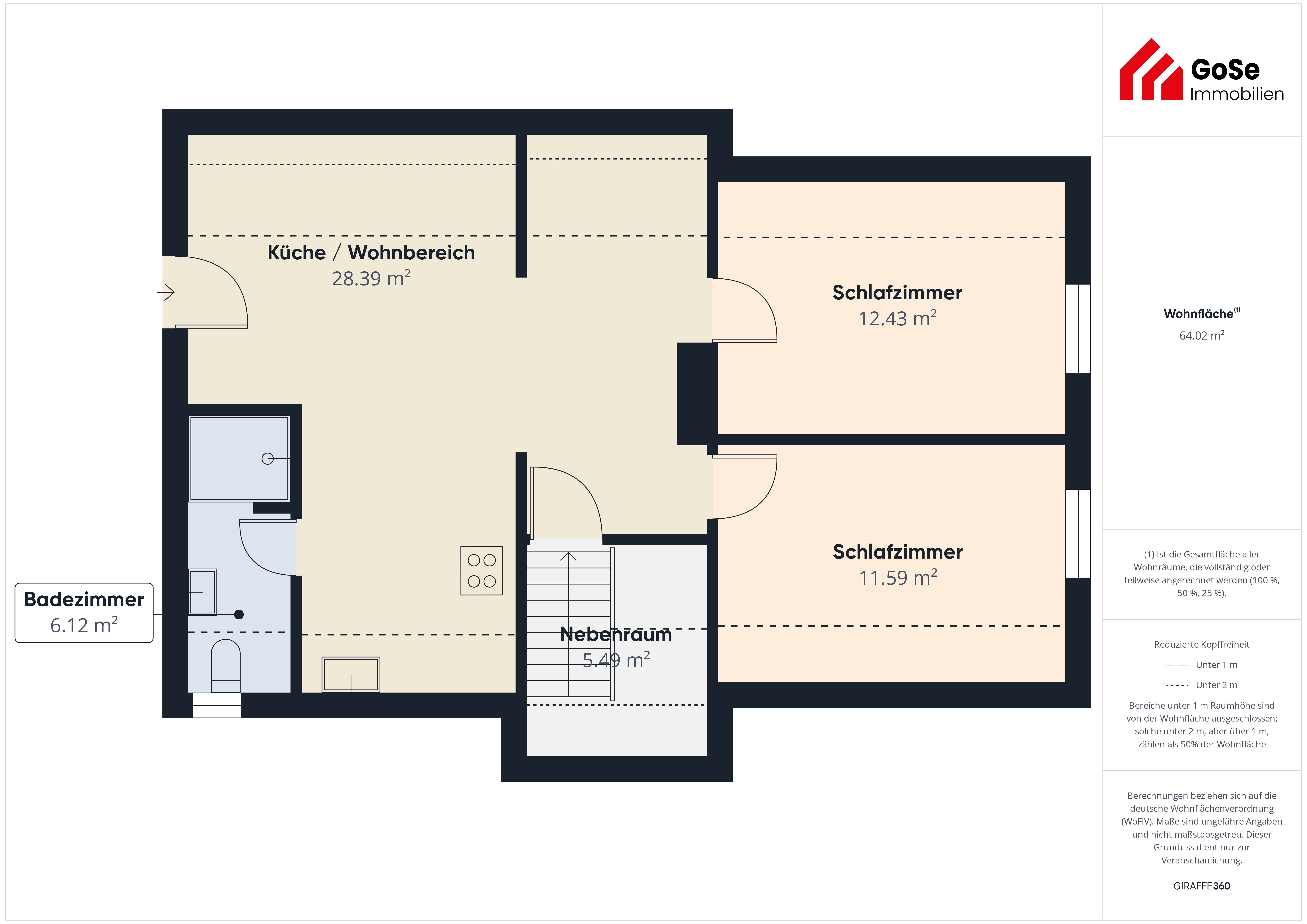 Insgesamt beträgt die Grundfläche der Wohnung 87 Quadratmeter, aber aufgrund der Schrägen können nur 64 Quadratmeter als Wohnfläche angesetzt werden. Diese sanierte Wohnung vereint moderne Annehmlichkeiten mit Komfort und Stil und ist zweifellos eine erstklassige Wahl für anspruchsvolle Mieter, die zeitgemäßes Wohnen schätzen.
